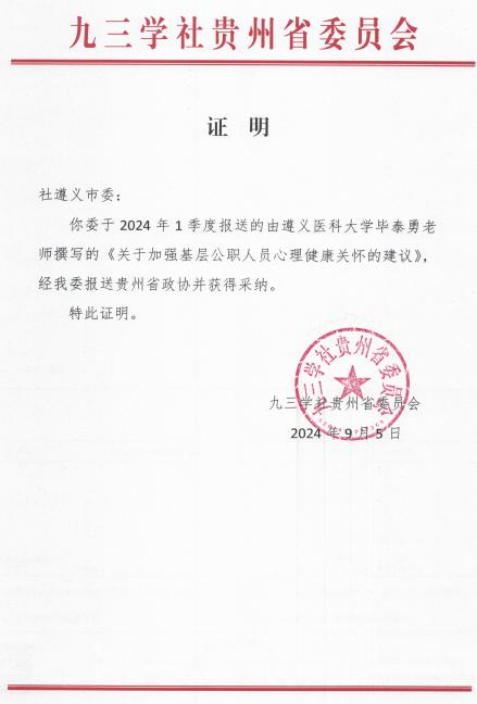 近日,公司应用心理学专业毕泰勇教授撰写的《关于加强基层公职人员心理健康关怀的建议》的调研报告经九三学社贵州省委员会报送贵州省政协,获得采纳。