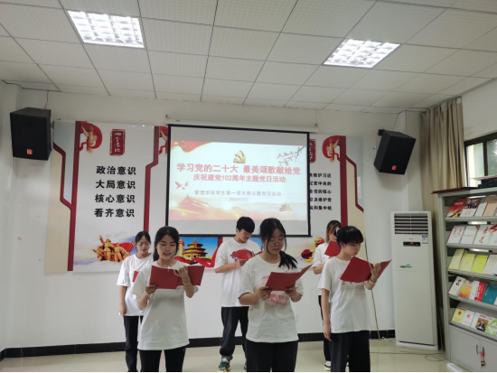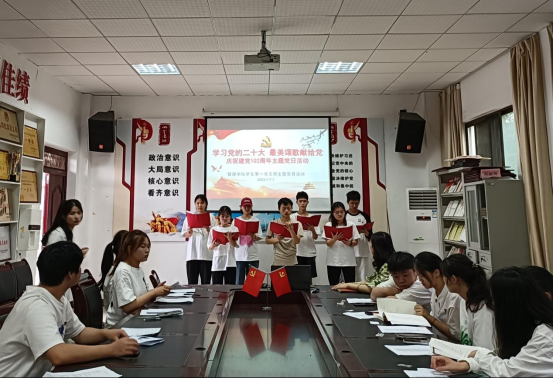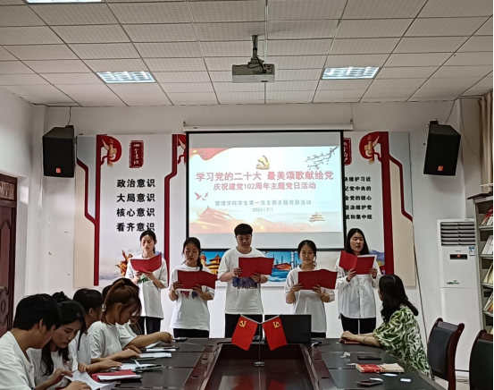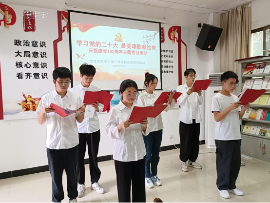 首先廖宇书记主持九位党员同志为九位新预备党员同志佩戴党徽。接着全体党员和预备党员在陈小芳同志的带领下进行入党宣誓,铮铮誓言,拳拳初心,彰显了身为党员的责任和担当,坚定了党员们永远奋进新时代的意志斗志,表达了对党无限忠诚和永不叛党的坚定承诺,引导党员从优秀传统中汲取营养,增加正能量。随着宣誓结束,在罗学丽同志的主持下正式拉开了“学习党的二十大,最美颂歌献给党”庆祝建党102周年主题党日活动的序幕。每一支队伍都为本次活动做了精心准备,通过朗诵来深情地表达心底的声音,献上对党诚挚的祝福,歌颂我们的党,向党表达了我们的感激和敬仰,充分展示出青年党员的精神风貌和永远听党话,坚定跟党走的信心和决心。